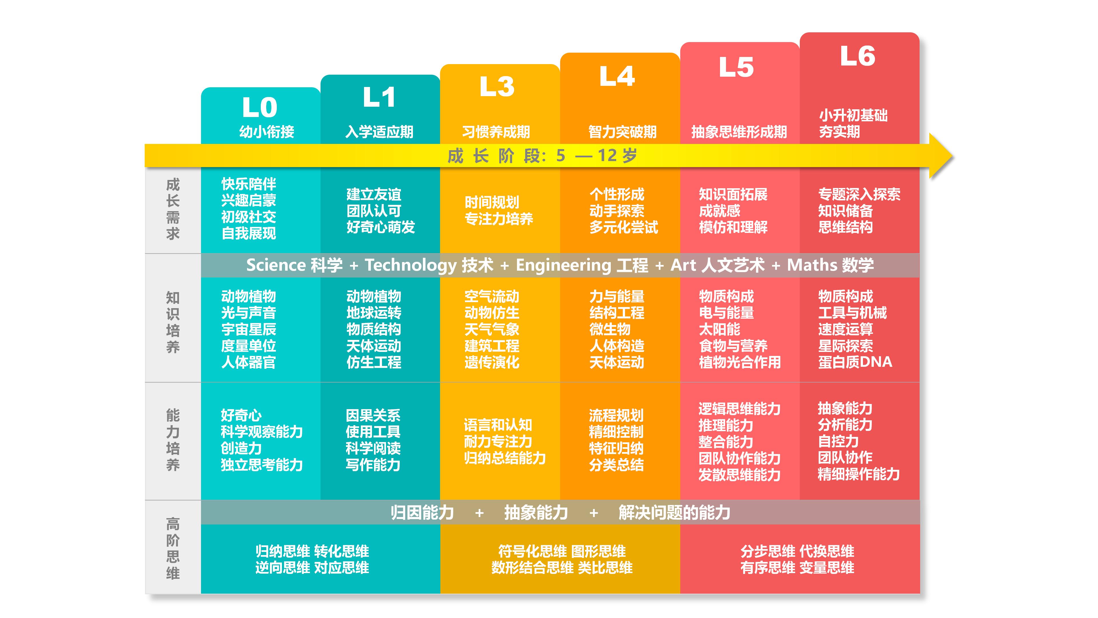 L0 幼小衔接:快乐陪伴、兴趣启蒙、初级社交。 L1 入学适应:建立友谊与规则感,萌发好奇心。 L3 习惯养成:时间规划、专注与有序行动。 L4 智力突破:动手探索、多元尝试与自我效能。 L5 抽象形成:知识面拓展,逻辑与推理结构逐步建立。 L6 小升初夯实:专题深入、结构化思维与综合表达。