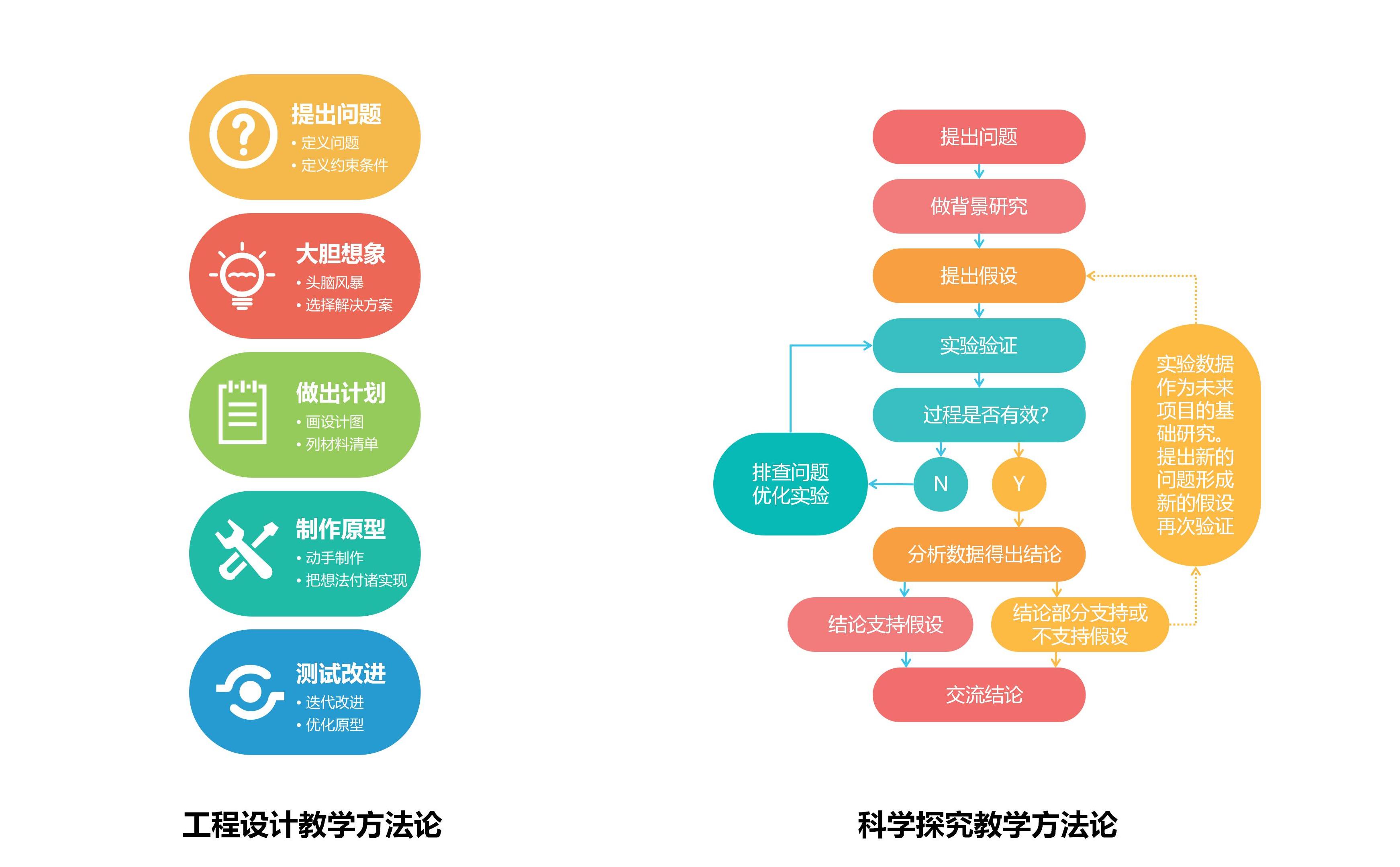 Learning approach 学习方法 工程设计法(Make it, then make it better)以“提出/定义问题→计划方案→制作原型→测试与优化→发布”为主线,把知识点嵌入“做得成”的项目里,训练解决问题与表达能力。 科学探究法(从假设到证据)“提出问题→背景研究→提出假设→实验验证→数据分析→交流结论”,实验数据沉淀为后续项目的基础研究,进入下一轮验证。