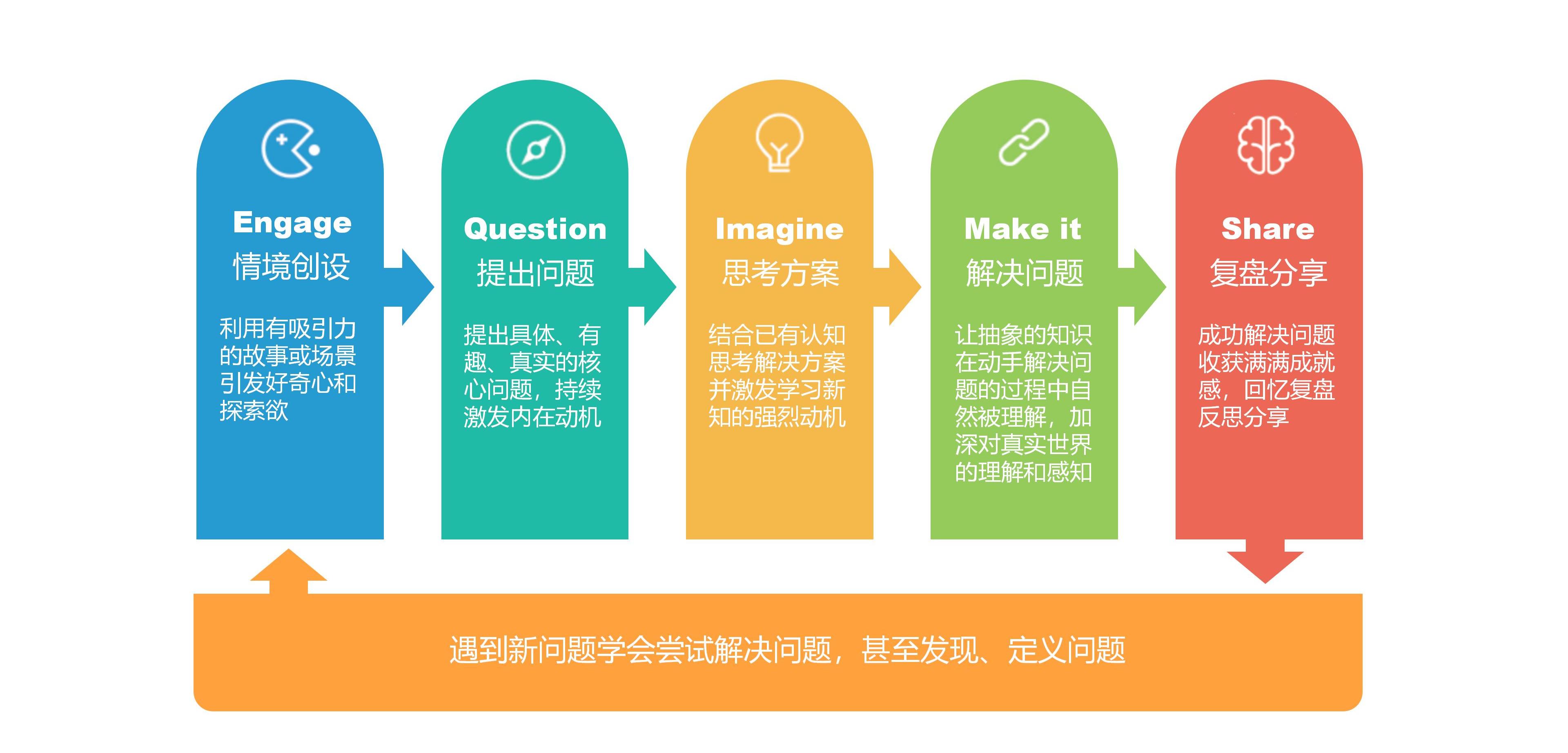 我们采用“螺旋式上升学习模型”,以学生为中心,构建一个不断深入、持续进阶的学习闭环。该模型融合情境、问题、思考、实践与分享五大环节,引导学习者在真实场景中主动探索、动手实践、反思成长,真正实现“学以致用、用以促学”。五大环节,层层深入: 情境创设(Engage) 通过生动有趣的故事与场景,激发学习兴趣与好奇心,让学习自然开始。 提出问题(Question) 引导学习者聚焦真实、有趣的核心问题,持续点燃内在学习动机。 思考方案(Imagine) 鼓励结合已有认知思考解决方法,激发学习新知的渴望。 动手解决(Make it) 在解决问题的过程中理解抽象知识,加深对真实世界的感知与理解。 复盘分享(Share) 通过复盘反思与成果分享,巩固学习成果,培养发现问题与定义问题的能力。