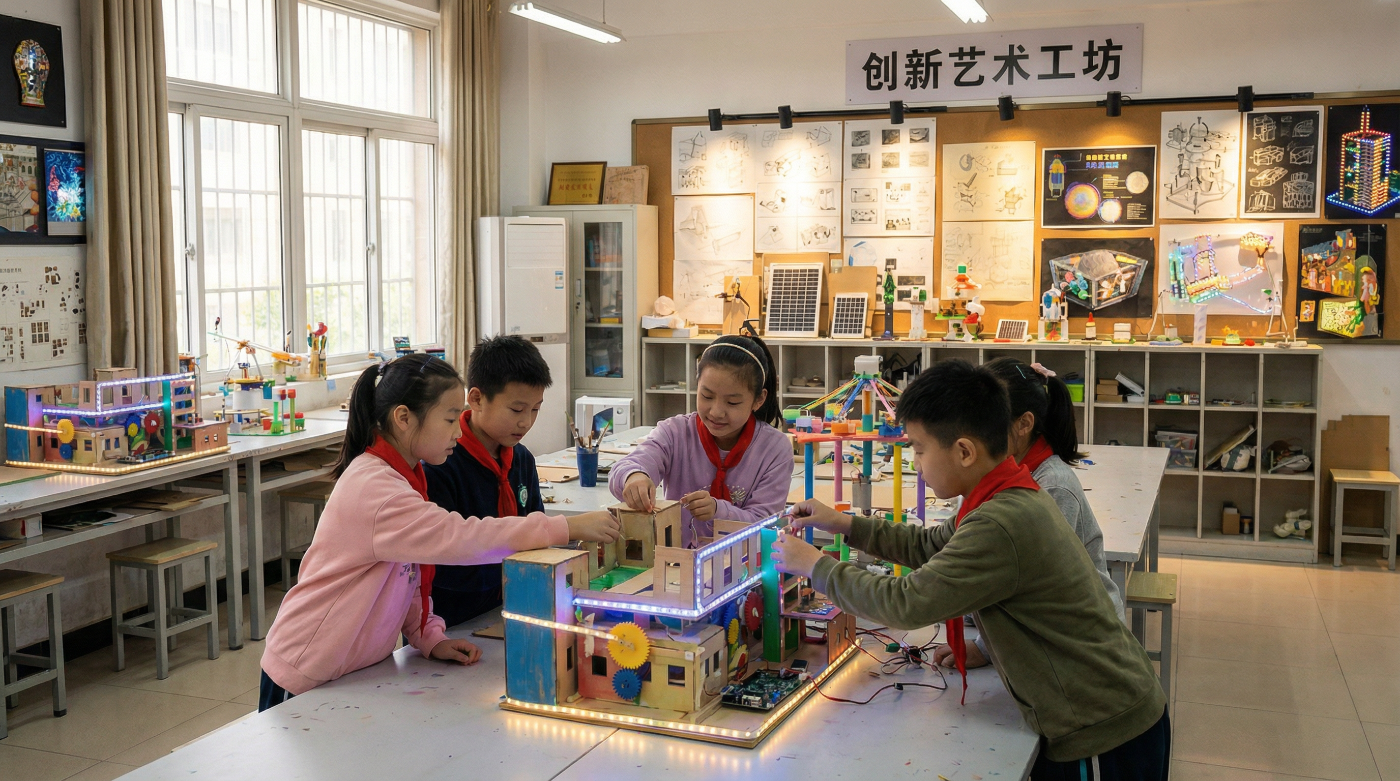 跨学科升级:将绘画、造型、视觉叙事与科学观察、材料实验、设计思维融合,形成“艺术 × 科学 × 工程”的项目式课程 项目式产出:聚焦高“出片率”的主题,如仿生造型、光影艺术、装置艺术、创新设计,保证每节课都有可展示作品 AI 赋能:使用 AI 进行角色设计、风格生成、构图参考与作品润色,支持学生表达与教师备课提效 交付包:任务链教案、示范作品库、步骤卡、展陈模板、作品说明卡、家长会流程